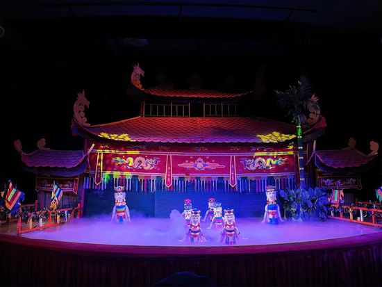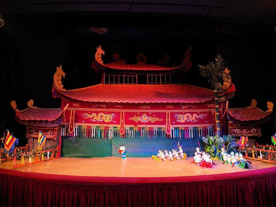 入口に大きな水上人形がいるので、入場前にまずは写真撮影を忘れずに♪もともとは北部の農村の大衆娯楽だったため、世界各国から観光客が訪れてくる現在もベトナム語のまま公演を続けています。シニカルな動きとストーリーをお楽しみに!