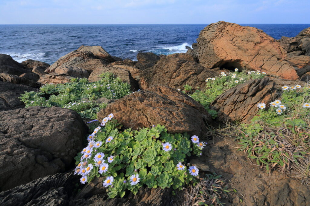 公園内には、黒く荒々しい岩肌があちらこちらに見受けられます。これは玄武岩と呼ばれる火山岩で、太古の昔、噴火によって誕生した角島の成り立ちを伝えています。また、角島では奈良時代から放牧が行われ、公園手前にある牧場では、今でも牛が草を食む牧歌的な風景を見ることができます。この風景は、時間を忘れさせてくれるほどの静けさと美しさを持っています。