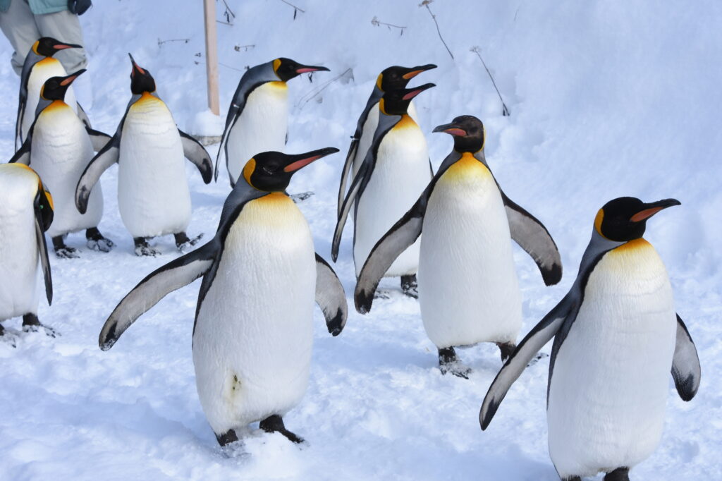 旭川市旭山動物園では、ペンギンが大人気です。4種類のペンギンが一緒に暮らしており、その愛らしい姿を間近で楽しむことができます。特に冬季限定イベント「ペンギンの散歩」では、雪の中を歩く可愛らしいペンギンたちの姿が見られますよ!