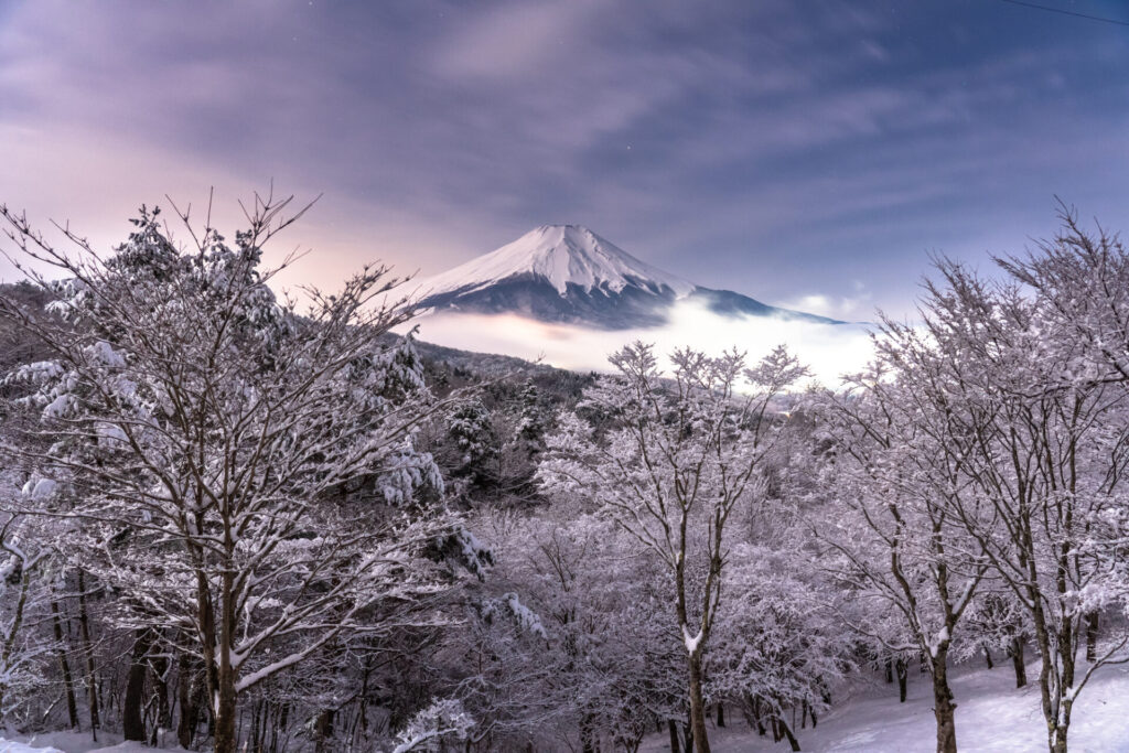「忍野八海」は、富士山の湧水が作り出す美しい池群で、富士山信仰の歴史も感じられる場所で、参拝客も多く訪れるスポットです。冬の時期には、雪景色と澄んだ水のコントラストが一層際立ち、幻想的な風景が広がります。
