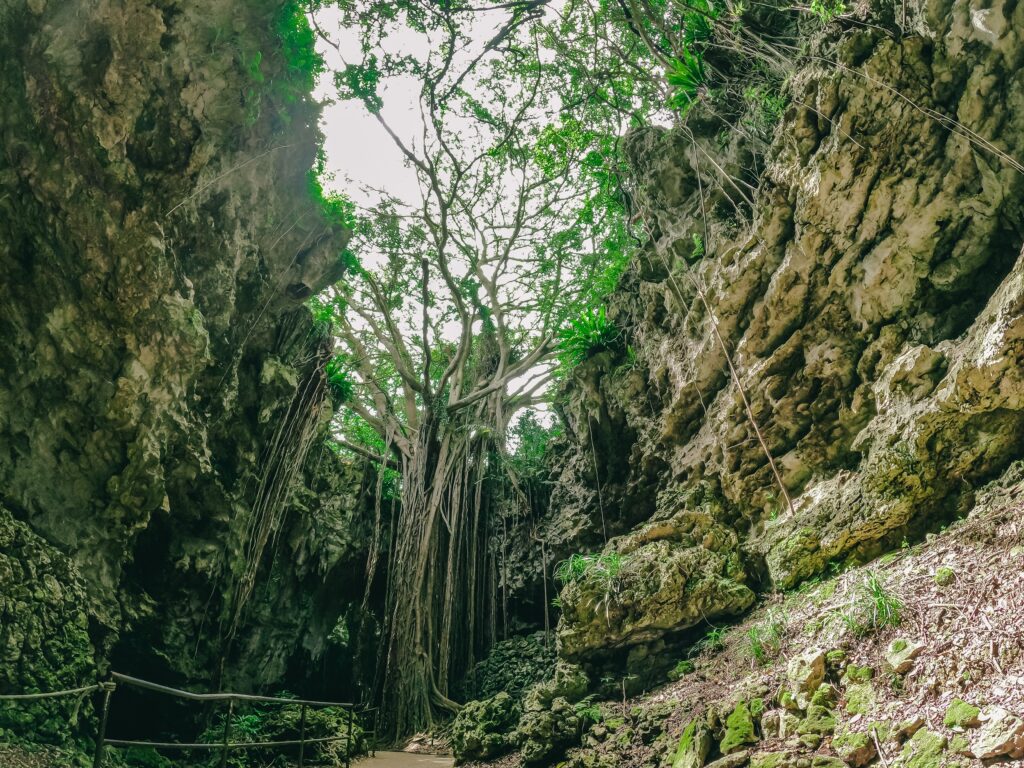 斎場御嶽では、2枚の巨岩の間にある三角形の洞門を通り抜けると、久高島を望むことができます。手つかずの自然と神秘的な雰囲気に包まれたこの場所で、心を癒やしてみませんか。