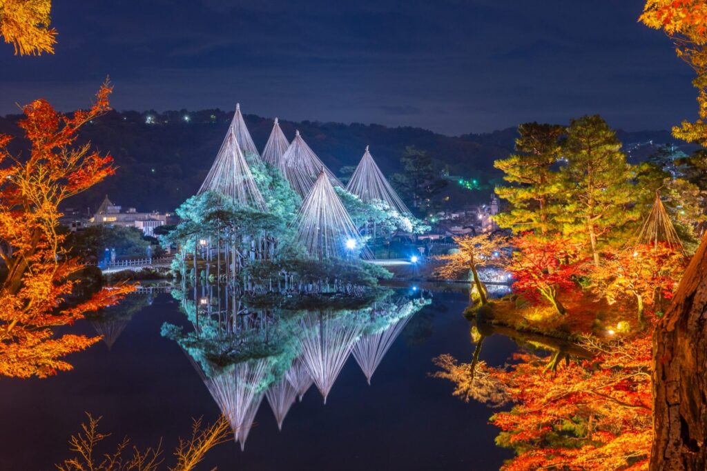 金沢を訪れたなら、兼六園でのひとときは欠かせません。この庭園は、日本三名園の一つとして知られ、四季折々の自然美が訪れる人々を魅了します。春には桜が園内を彩り、夏は緑豊かな木々が涼しげな影を落とし、秋には紅葉が園を彩り、冬には雪景色が静寂の美を演出します。