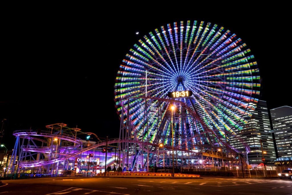 横浜の夜を象徴する「コスモクロック21」は、夜になると別世界へと変わります。この巨大な観覧車からは、横浜の夜景を360度楽しむことができ、特にみなとみらいの光り輝く景色は息をのむ美しさです。