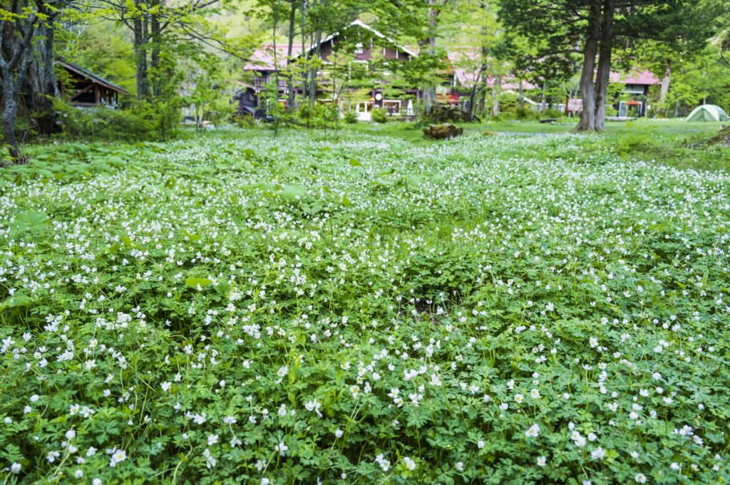 大正池周辺は、ウグイスやコマドリ、コルリ、キビタキなどの野鳥の生息地でもあります。静かな森の中を歩きながら、鳥たちのさえずりを聞くことができるでしょう。また、6月上旬には小梨とニリンソウの花が満開となり、広々とした草原にそよぐ姿を眺めることができます。