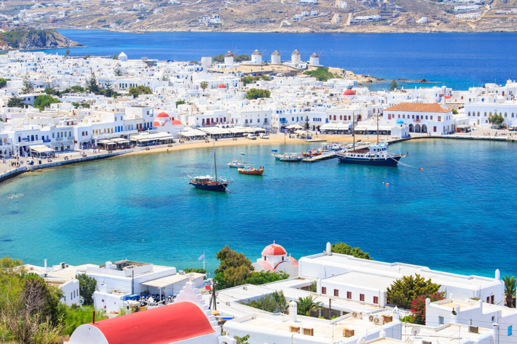 まずは、「エーゲ海に浮かぶ白い宝石」と称されるミコノス島。白壁と青空のコントラストが美しい街並みと、絵本のような可愛らしい風景が広がります。また、16世紀に建てられた歴史ある風車「ミコノスの風車」は、訪れる人々をノスタルジックな雰囲気へと誘います。
