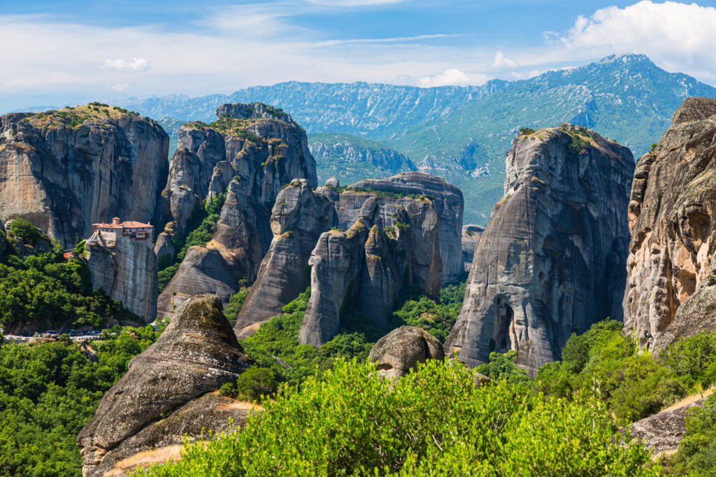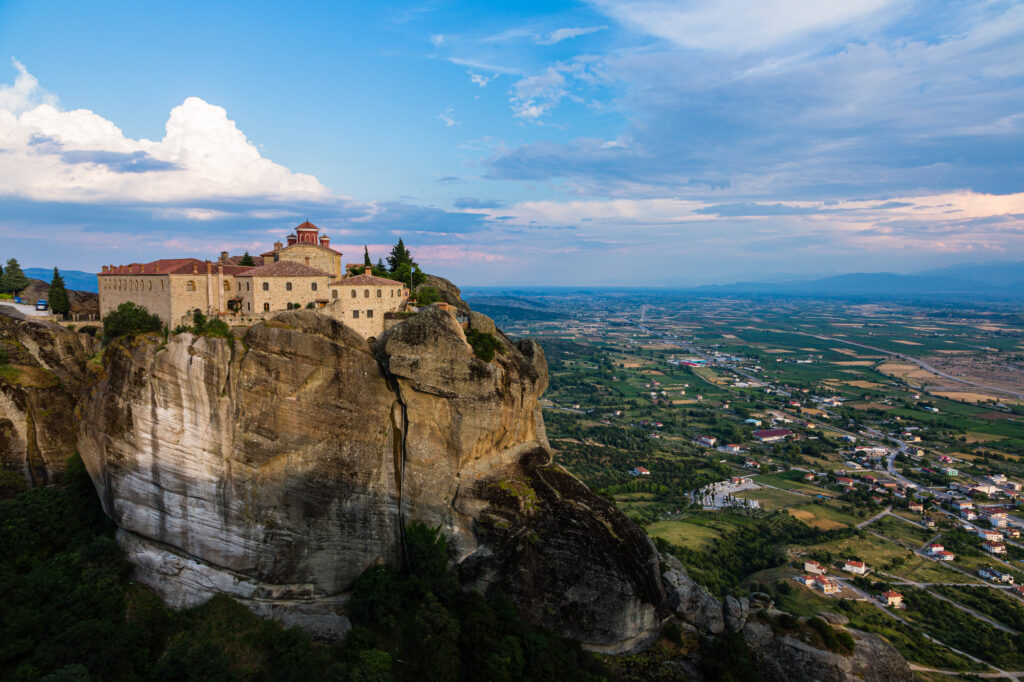 ギリシャ北西部のテッサリア地方に位置するメテオラ修道院は、その壮大な自然と歴史的な価値から世界複合遺産に登録されています。メテオラとはギリシャ語で「中空に浮かぶ」という意味で、その名の通り、巨大な岩山の上に建てられた修道院がまるで空に浮かんでいるかのような光景は、訪れる人々を圧倒します。24の修道院が存在していましたが、現在は6つの修道院が活動を続けています。