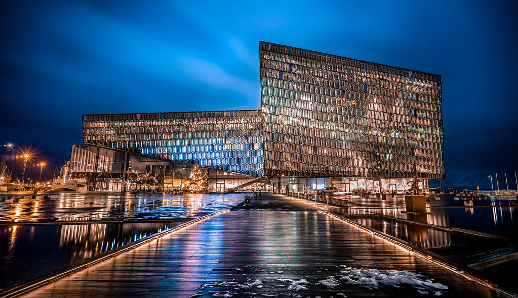夕方には、レイキャビクの象徴的な建物であるハルパコンサートホールを見学しましょう。ガラス張りの外観が美しく、内部のデザインも見応えがあります。特に夕暮れ時には、ガラスに映る夕日が幻想的な雰囲気を醸し出します。
