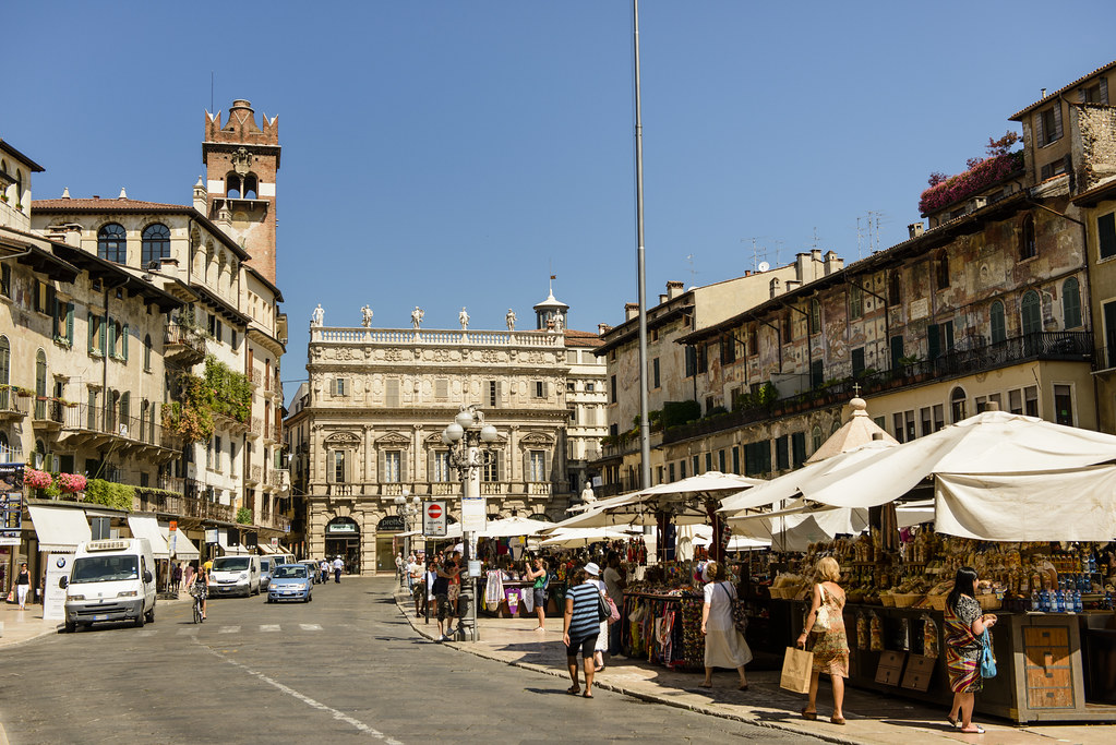 夕方には、ヴェローナの旧市街中心に位置するエルベ広場を訪れてみましょう。エルベ広場は、毎日開かれるマーケットで賑わい、地元の特産品やお土産を購入するのに最適な場所です。