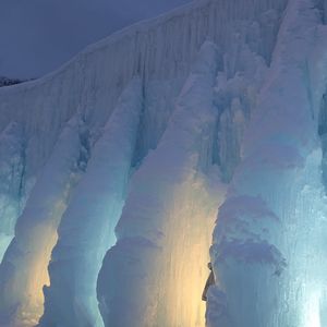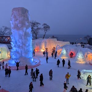 数々の氷の芸術品が様々な色でライトアップされ幻想的な空間が広がっていて、時折降る雪が更にロマンチックな雰囲気にしてくれます