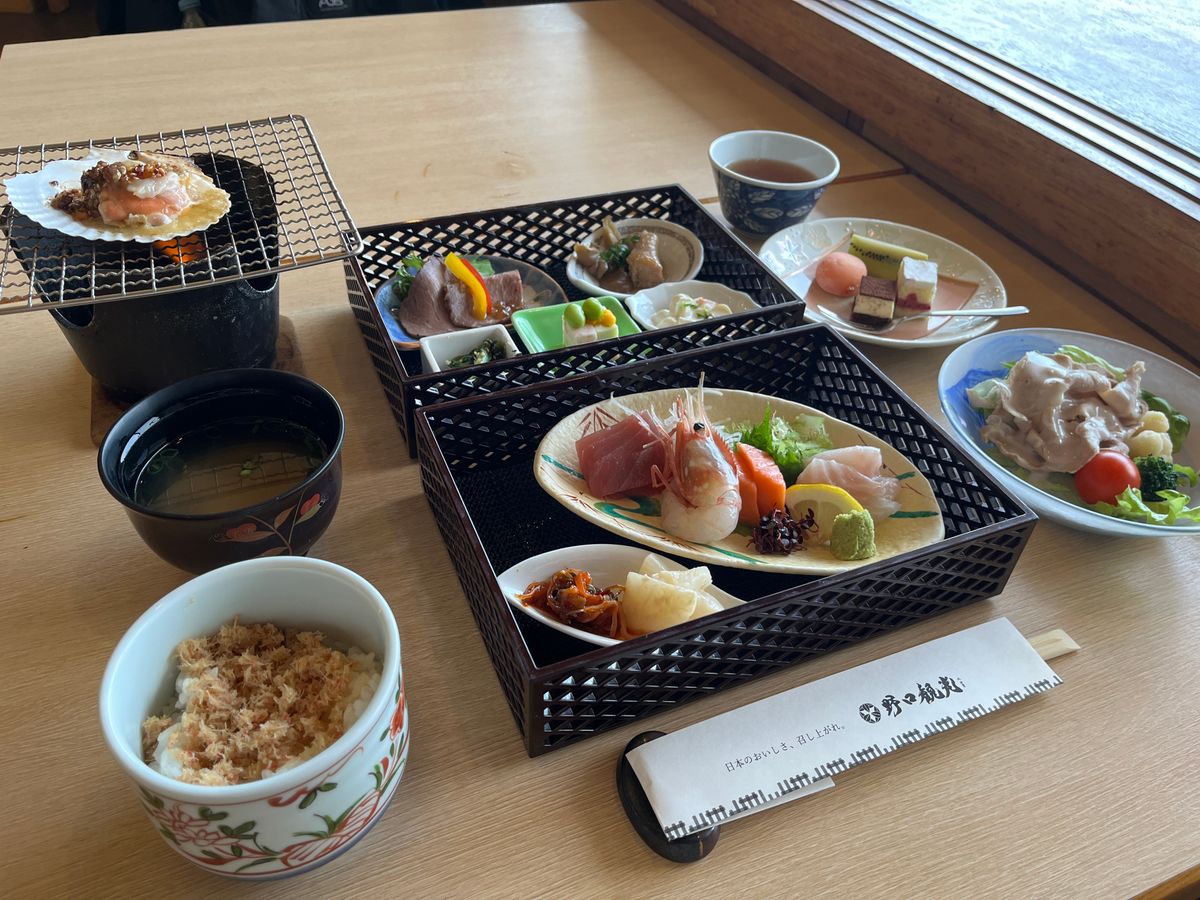 In terms of sightseeing, the bus moved smoothly, and we were given more time than planned at Amanohashidate, which was enjoyable. The sightseeing boat in Ine was quite chaotic with seagulls swarming around. There was probably an explanation about the history and scenery of Ine, but I couldn't hear anything. A long time ago, there was a bestseller called "Jonathan Livingston Seagull," but this was more like "Jama-san the Seagull (the annoying one)."