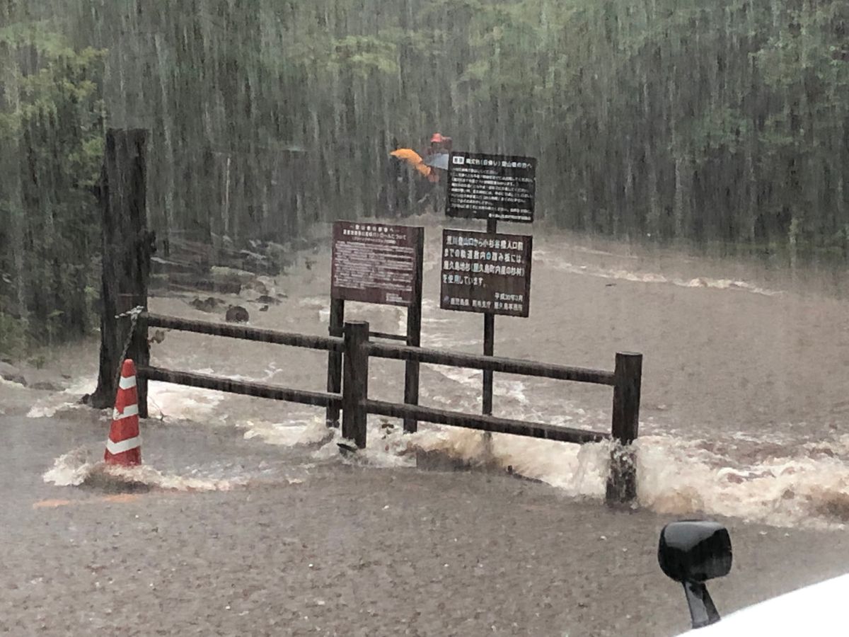 ラッキーなことに縄文杉までは行くことができましたが、帰りは増水により道が決壊している場所もありました。他の登山者が引き返してくる中ガイドさんは何の躊躇もなく滝のようになった道を突き進み先導してくれました。登山道まで戻ってくる頃には膝上まで水が上がってきているところもありました。登山道まで戻ってきてバスに乗り込んでホッとしたのもつかの間。倒れた大木で道を塞がれてしまいバスが前に進めない状況。そんな中ガイドさんは率先して外に出てくれ、倒れた大木をノコギリで切ってくれました。またバスの中で一夜を過ごすことになった時も、ガイドさんが豪雨の中外に出