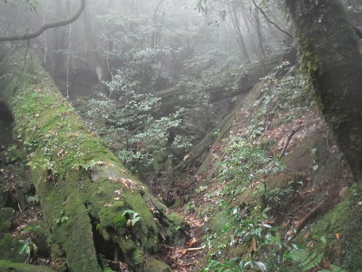 The rain started unexpectedly. The weather forecast doesn't hold true in Yakushima. The moss and trees, wet from the rain, looked vibrant and beautiful. There was some mist, which created a fantastic atmosphere. I couldn't see Taiko Rock because it was dangerous due to the slippery conditions from the rain. The guides I passed all said, "It's tough!" and I really started to worry if I could make it to the end, but I pushed through. My knees, back, and hips are all sore, and I don't even know how to care for them. It might not be suitable for those who want to take photos slowly.