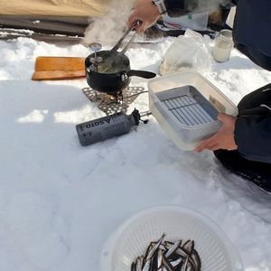 I caught a lot of wakasagi while ice fishing in the tent. It was very cold, but I enjoyed wakasagi tempura and warm soup, which were delicious. Additionally, I was able to see both the Steller's sea eagle and the white-tailed eagle, and I borrowed binoculars to take some photos.