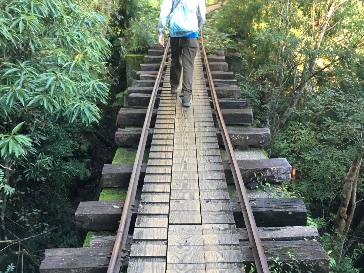 朝食を食べて軽い準備運動を終えたら5:50頃出発。ガイドさんを先頭に行きのトロッコ道はもくもくと歩き、順調に大株歩道入口まで到着。トイレを済ませてここから本格的な山登りでした。