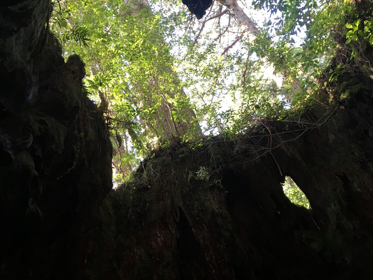 昼食と着替えを済ませ、さあ帰ろうというちょうどその時、ほんの数分でしたが霧雨に煙る雲の隙間から一条の光が巨大の縄文杉に差してきました。神々しくも壮麗なその光景はまさに息を飲むほどの美しさで、あとは下りるだけという安心感もあいまって、登りの苦労は完全に吹き飛びました。
