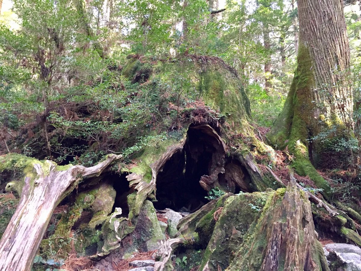 もののけ姫の題材となった苔むす森を通ったり、太鼓岩でジャンプしたり楽しみながらウィルソン杉の切り株のところで昼食。