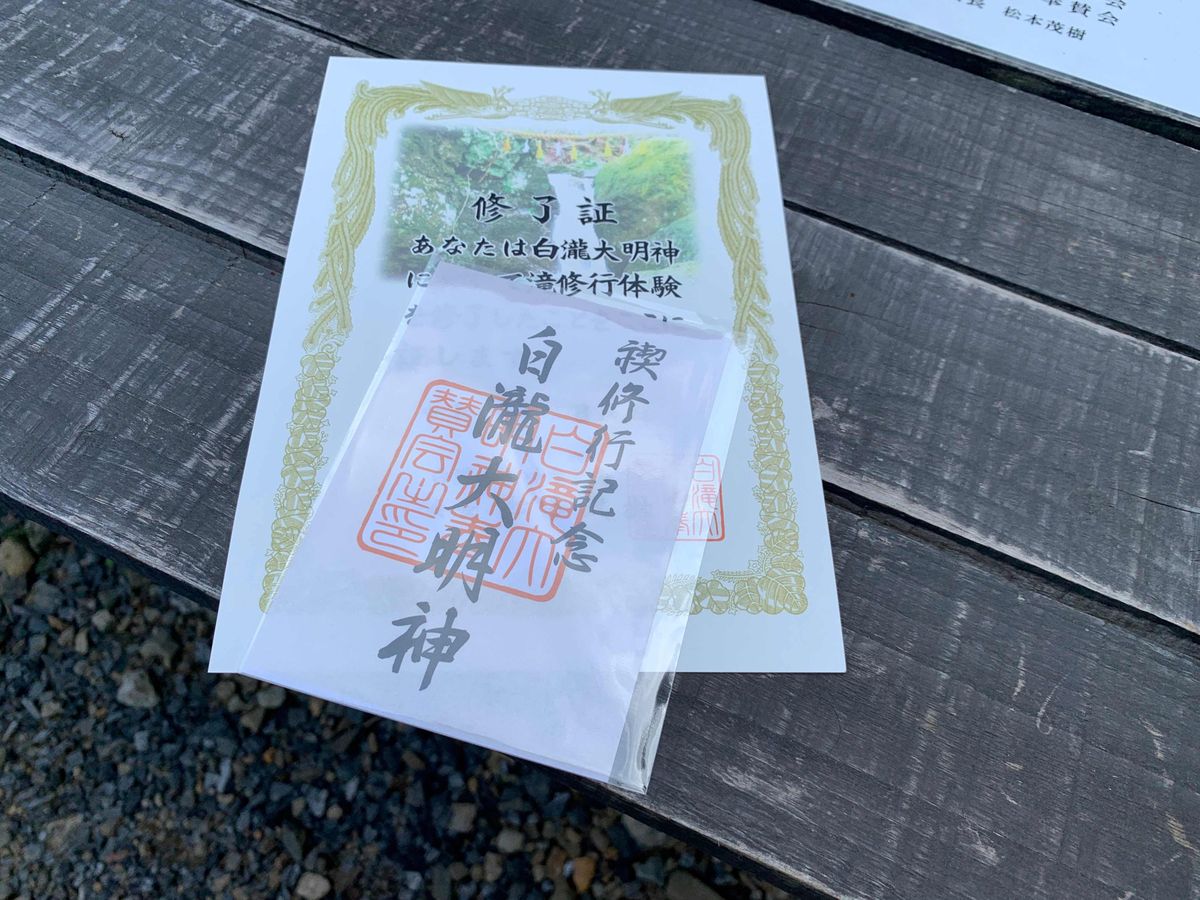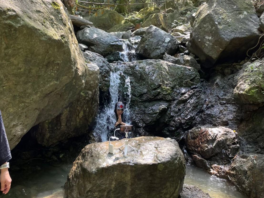 現地では小屋でお借りした作務衣に着替えをし、いざ滝行へ。