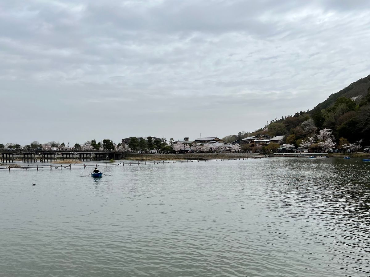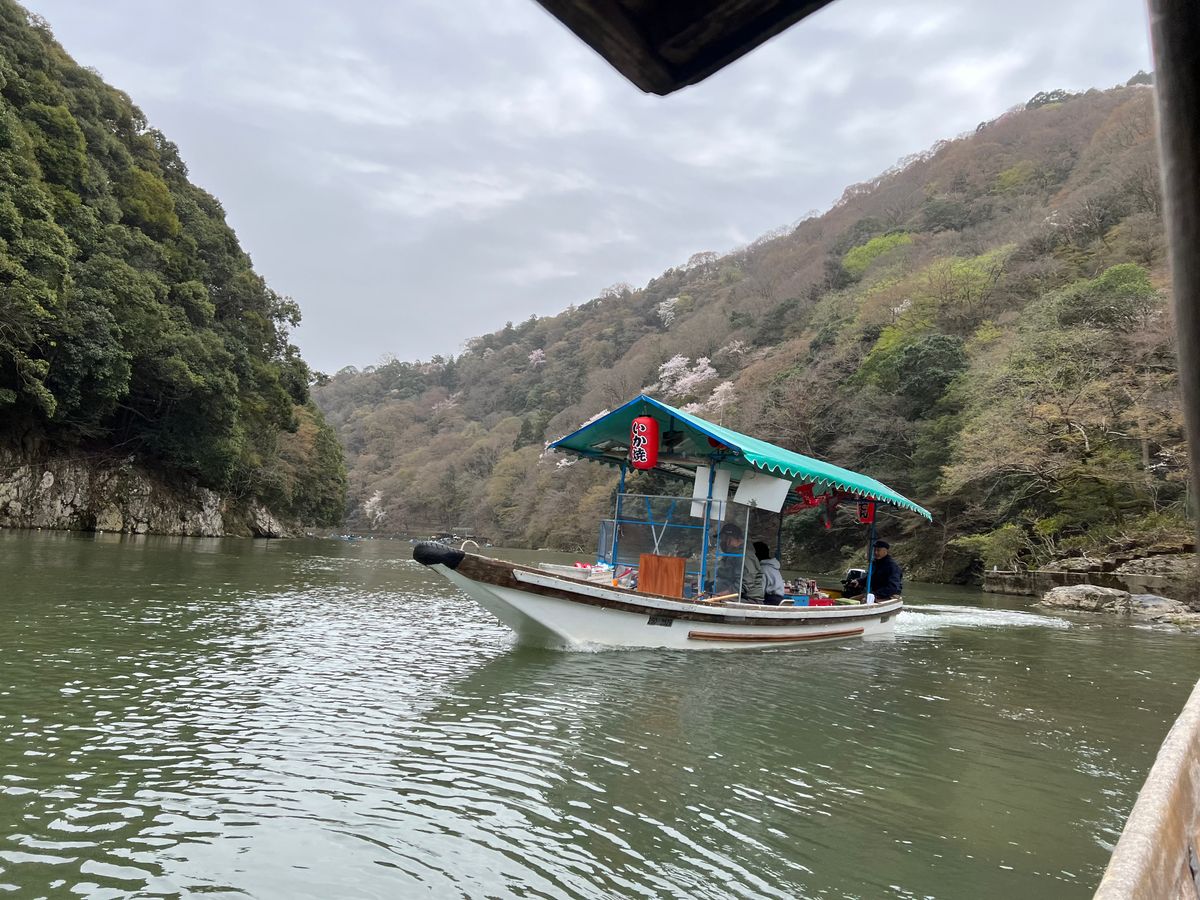 船の上では、番頭さんが景色や京都についていろいろなお話をしてくれ、写真を撮ってくれたりしました。又船のお店が途中で来て横付けをし、おでんや団子、ビールなどが買え、飲んだり食べたり笑ったり、カモに餌をあげたりと、とても楽しかったです。