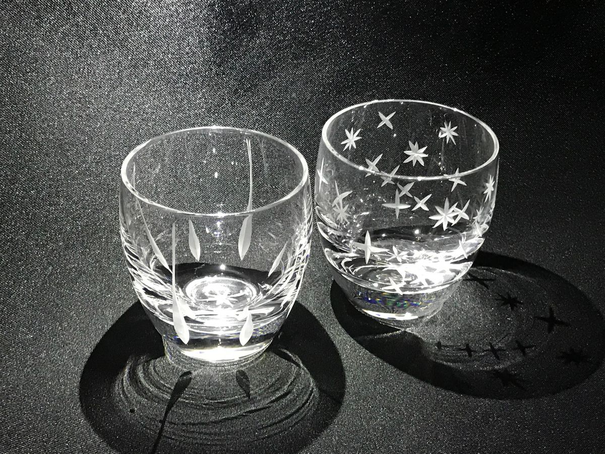 まずはグラス選びから。追加料金で色付きのグラスを選ぶこともできます。その後はデザインを決め、練習→本番。怪我をしないかとても不安でしたがその心配は不要で、想像より安全で平易な作業でした。