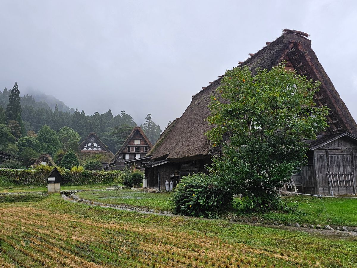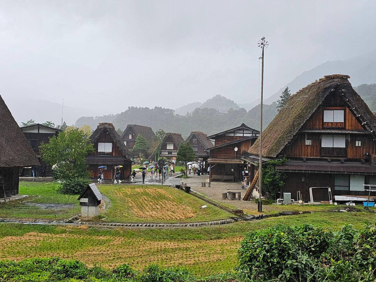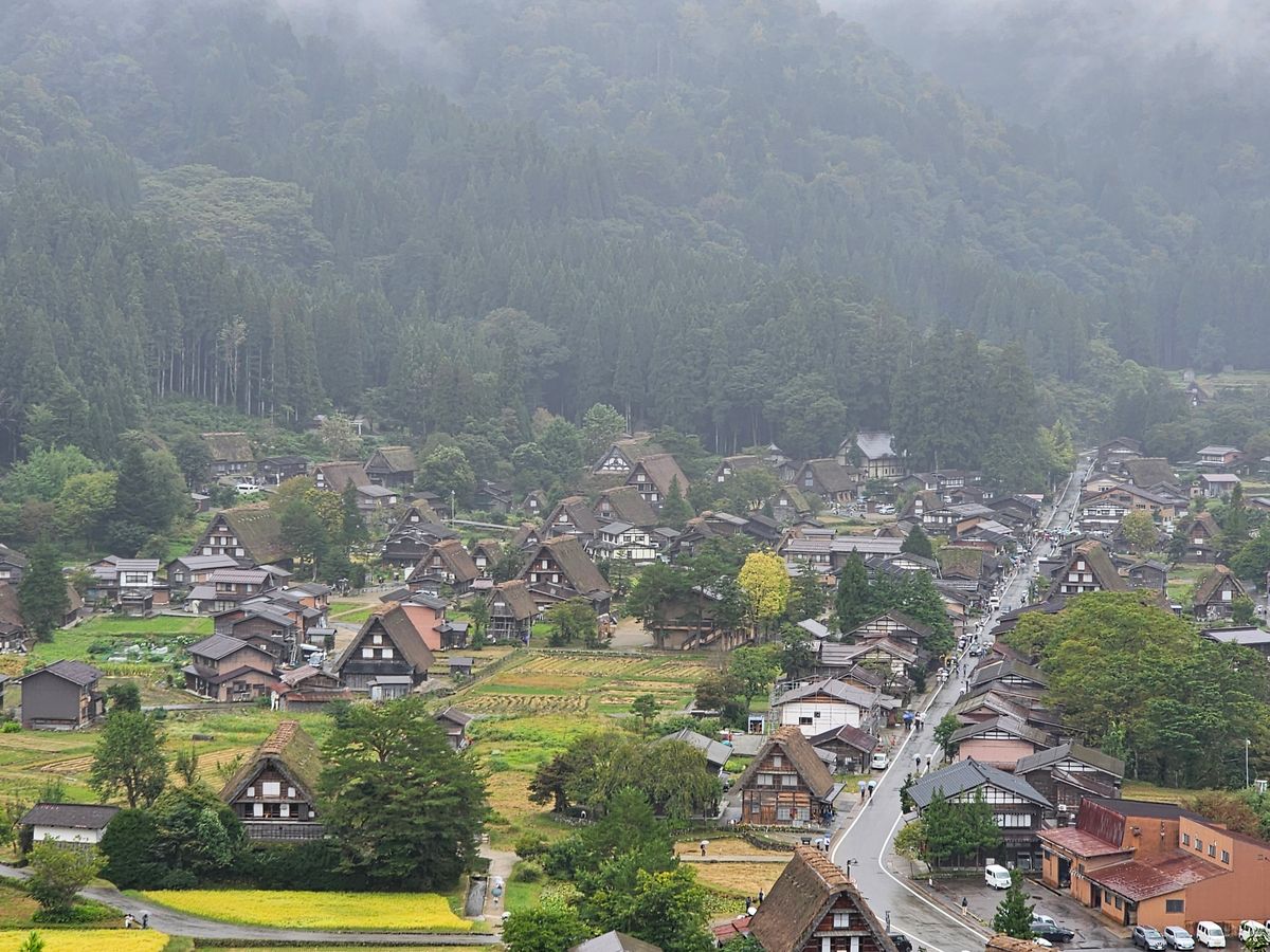 Yes, it was a warm day, but it rained. As we approach the season of autumn leaves, the mountains surrounding Shirakawa-go may have been shrouded in mist, and the rain-soaked leaves of the trees might have looked beautiful against the gassho-zukuri architecture.