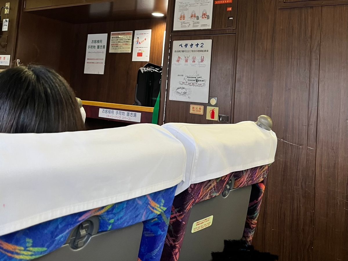 Initially, I planned to take the jet foil on the way there and the ferry on the way back, but considering dinner time, I decided to take the jet foil back as well. It was comfortable without any shaking, but I didn't realize that I had to keep my seatbelt on the whole time and couldn't go out on deck. I was expecting the essence of a sea voyage, so if I had the time, I would have preferred the ferry.