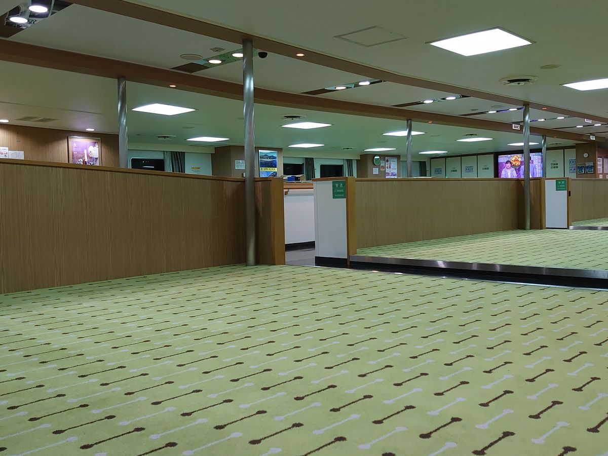 It took three and a half hours by ferry from Nagasaki Port to Fukue Port, but I think it was good because it was cheap and a little less than the regular fare. Inside the ship, there were many people lying down on the carpeted sleeping area watching TV, but I couldn't consider the carpet clean and the smell was concerning, so I spent my time sitting and watching TV instead.