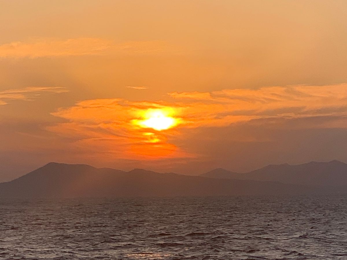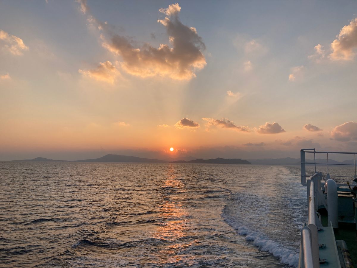 フェリーは甲板に出られるので、写真のように五島灘に沈むきれいな夕日を見ることができました。