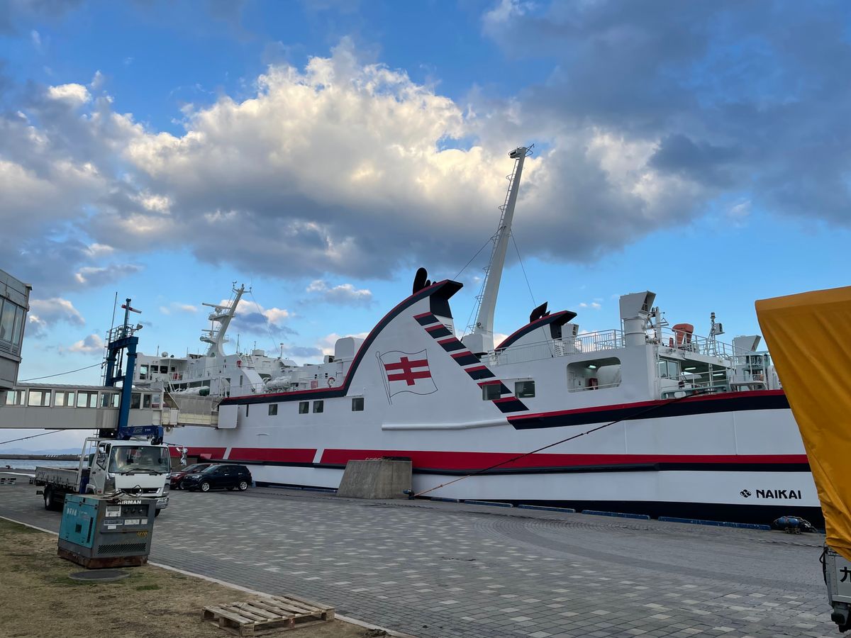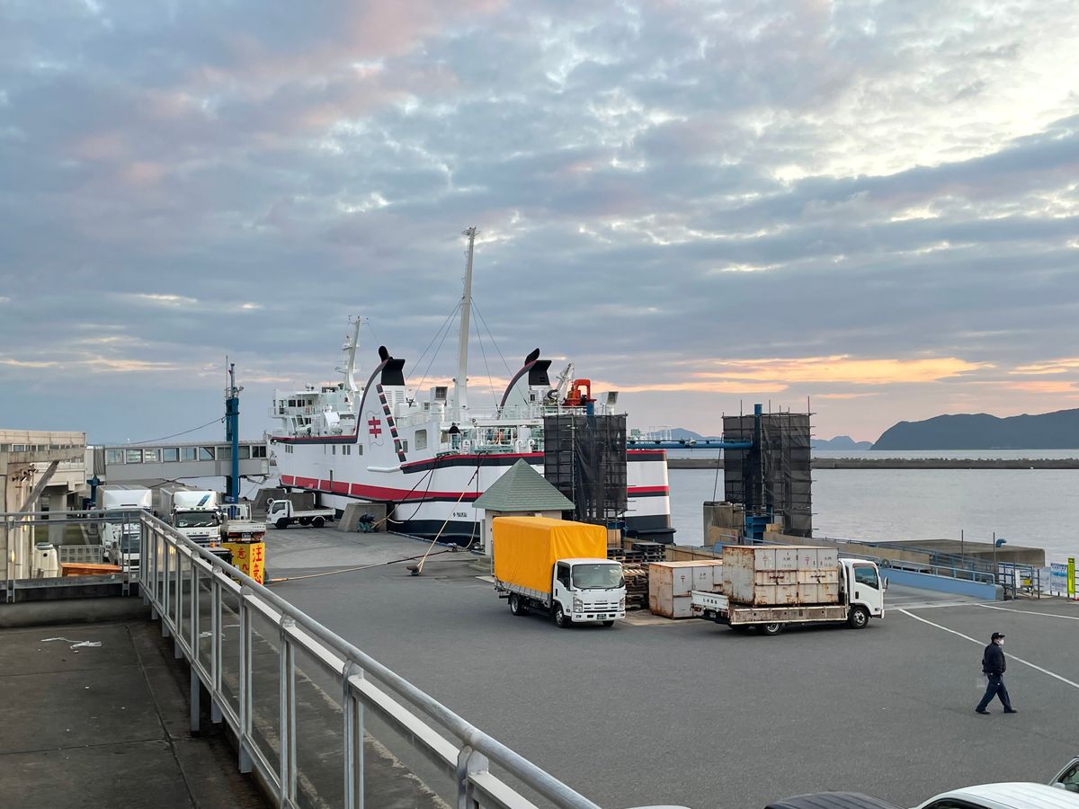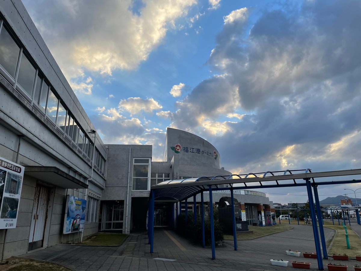 On the way there, I took the高速船 (high-speed boat), but for the return trip, I chose the ferry departing from Fukue Port at 16:50. The ferry allows you to go out on deck, so I was able to see the beautiful sunset over the Gotō Sea, just like in the photo.
