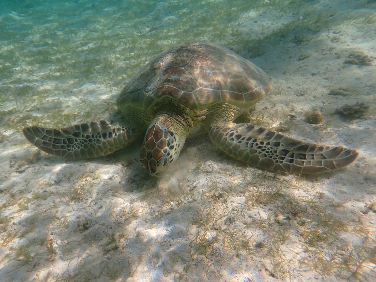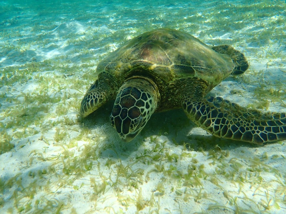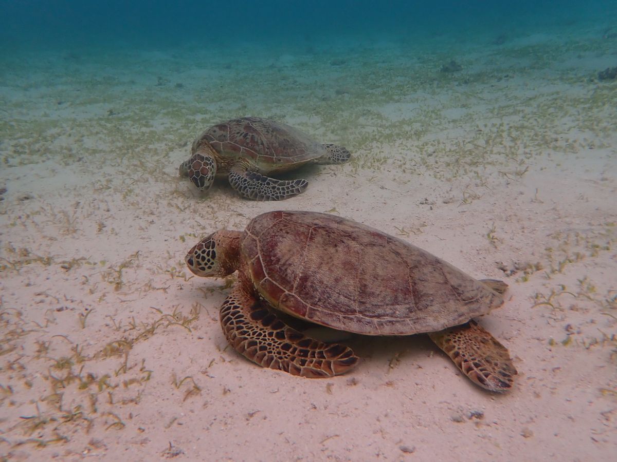It was adorable to see two friendly turtles happily eating seaweed together! On that day, there were many more sea turtles than usual, and I enjoyed it as well.