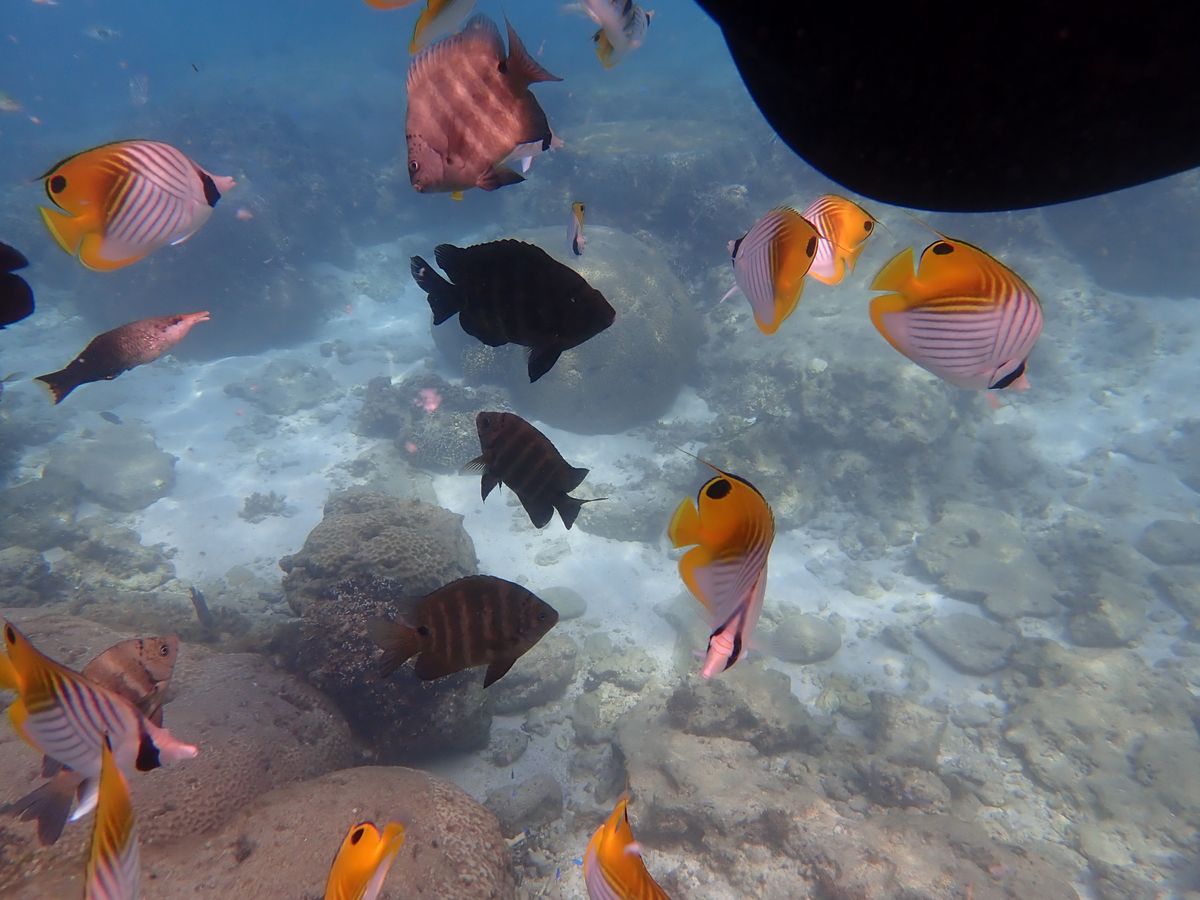 シュノーケリングでは、海に入ってすぐにウミガメさんに遭遇!浅瀬だったので一緒に写真を撮る事が出来ずに残念でしたが、とても近くで可愛いお顔を見る事が出来ました❣️海の中はまるで水族館の様で、カラフルな小魚達にすっかり見惚れていました。泳ぎが得意ではない娘も、ライフガードのお陰で安心して海の中を観察する事ができた様です。ガイドさんはお魚の説明をしてくれたり記念撮影等たくさんの写真を撮って下さいました。
