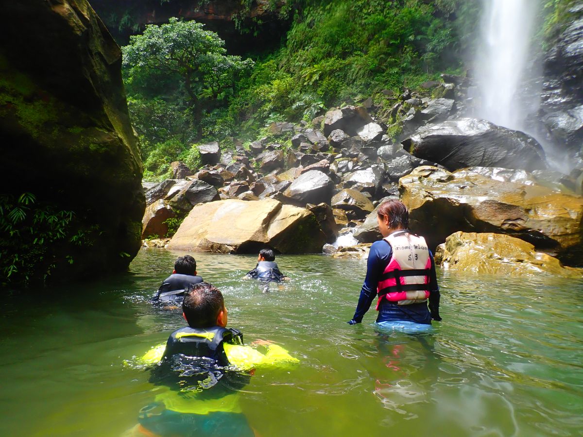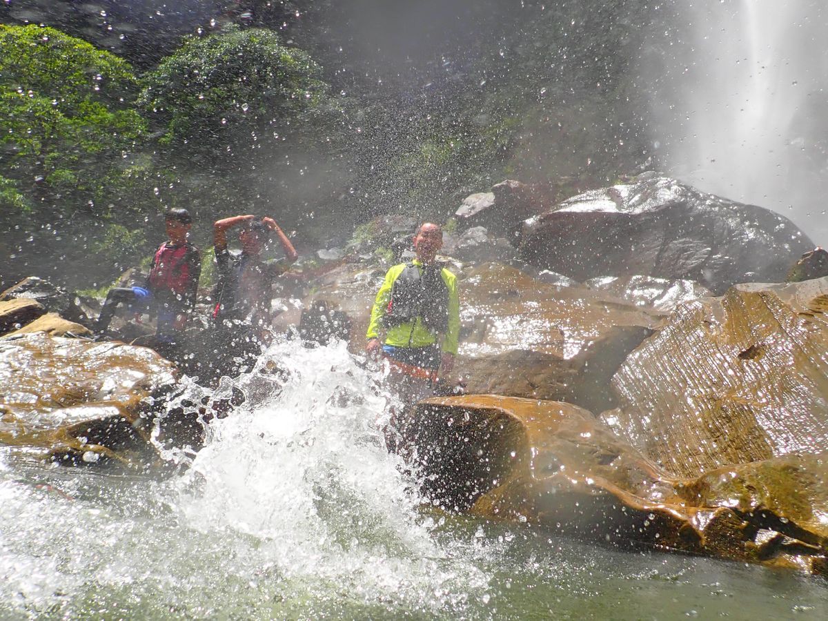 なかなか険しい道のりを進むこと15分か20分いくと滝壺に到着。滝の絶景を目の当たりにすると、汗だくで歩いてきた疲れも忘れ、滝壺にダイブ