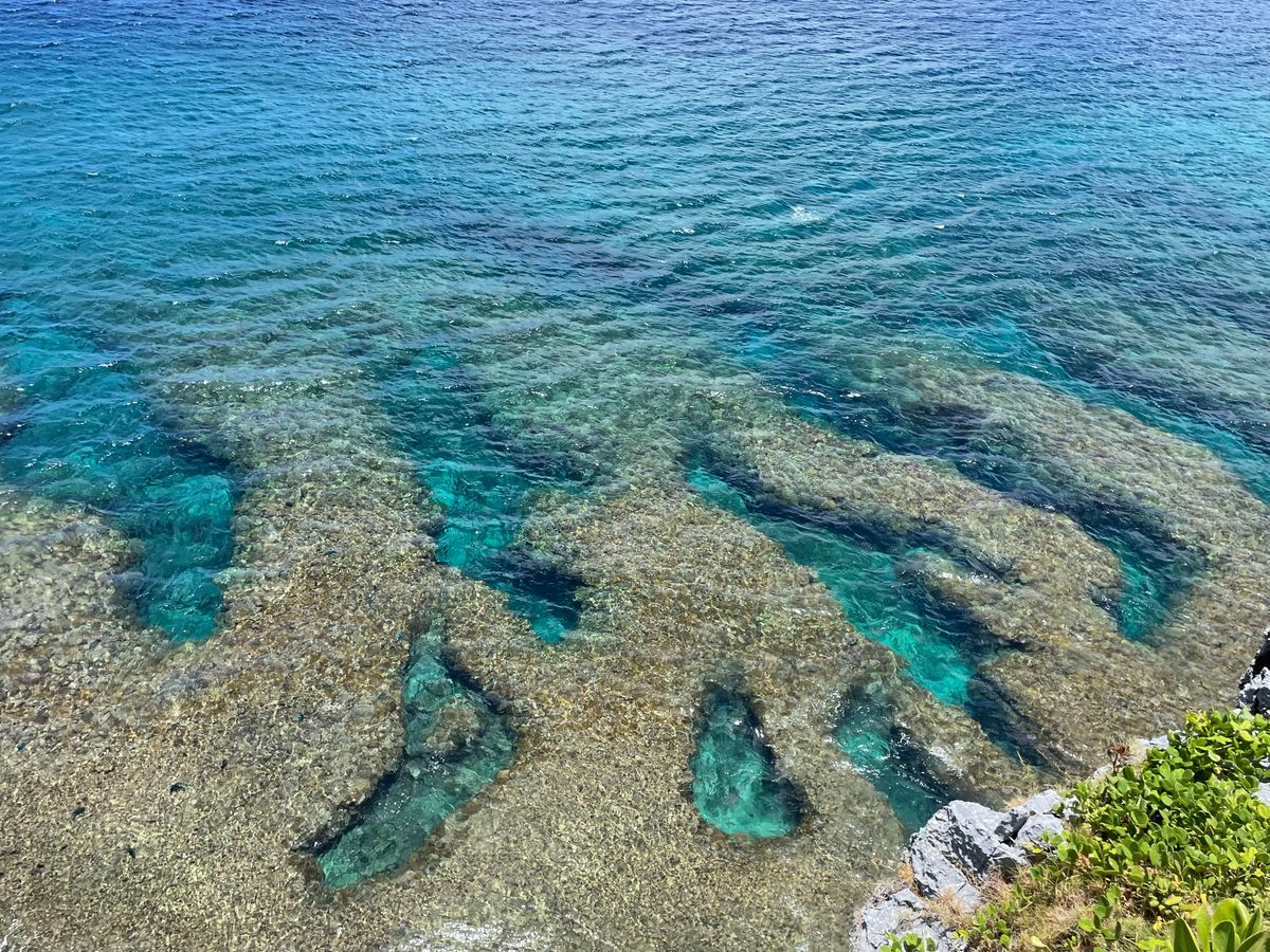 万座毛での船底がクリアで海の中が見えるカヤック。