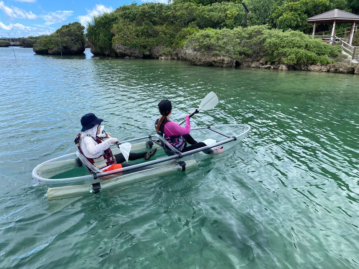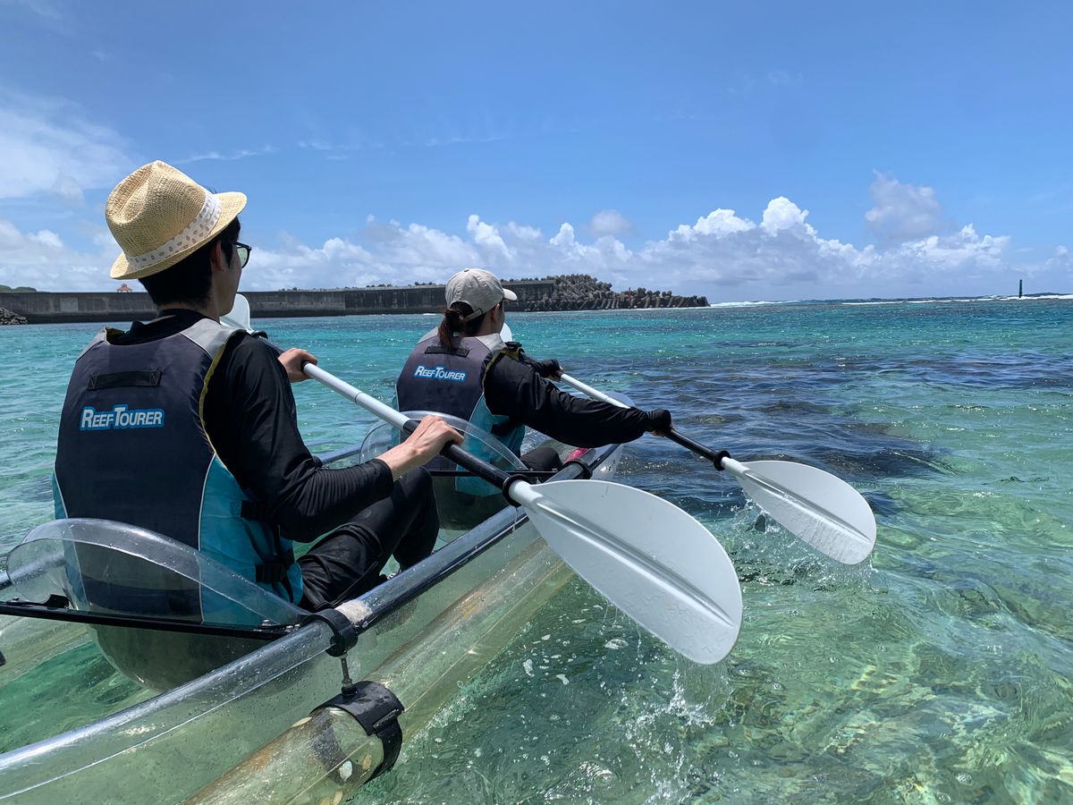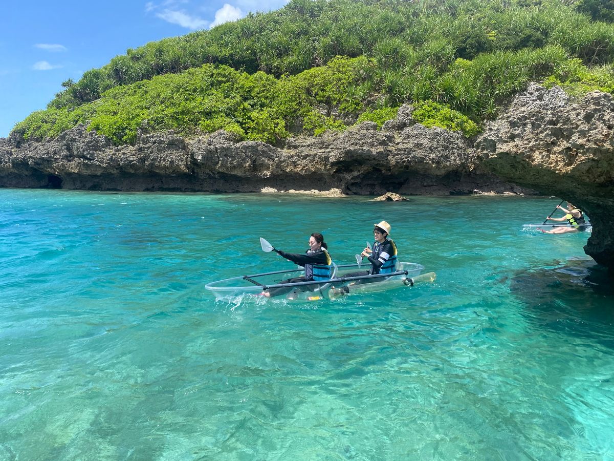 The day before, I received a call informing me that the location had changed from Yonaha Maehama to Imugya Marine Garden. I was looking forward to Yonaha Maehama, but I was glad that Imugya is a safe bay where children can also enjoy themselves, especially since I am not very familiar with marine activities. It was the first day of a three-day weekend, but I arrived at the free parking lot around 10:20 and was able to park. When I went kayaking, I only brought my smartphone and a bottle of water. They kindly lent me a waterproof case for my smartphone, which was very helpful. The staff will take care of other belongings, but I think it's best to leave unnecessary items (like valuables) in the car. The staff carefully taught us how to handle the paddles, and the tour began. They pointed out spots with beautiful fish, and I was able to see Nemo right at my feet, so I was glad I chose the clear kayak. They also took photos along the way, and since the weather was nice that day, there were drone shots as well. After the tour, I received about 30 photos and drone videos via AirDrop right on the spot. They even created a highlight video with music, and I was impressed by the professional finish. I think this tour is quite a bargain for what you get. It became a wonderful memory on the last day of my trip to Miyako Island. Thank you very much!