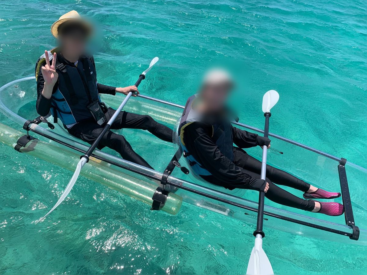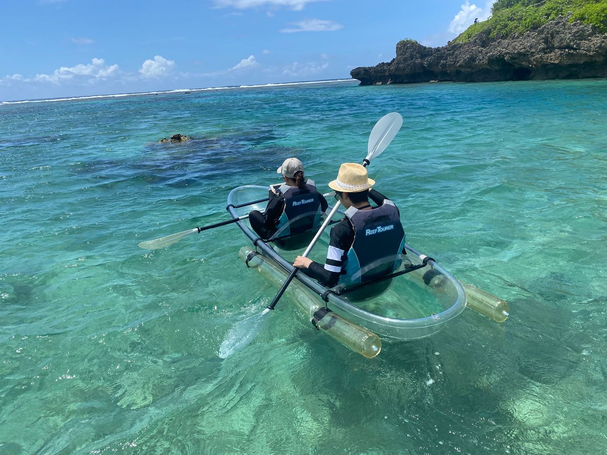 透明のカヤックで下を向くと珊瑚やお魚たちがたくさん見えました。
