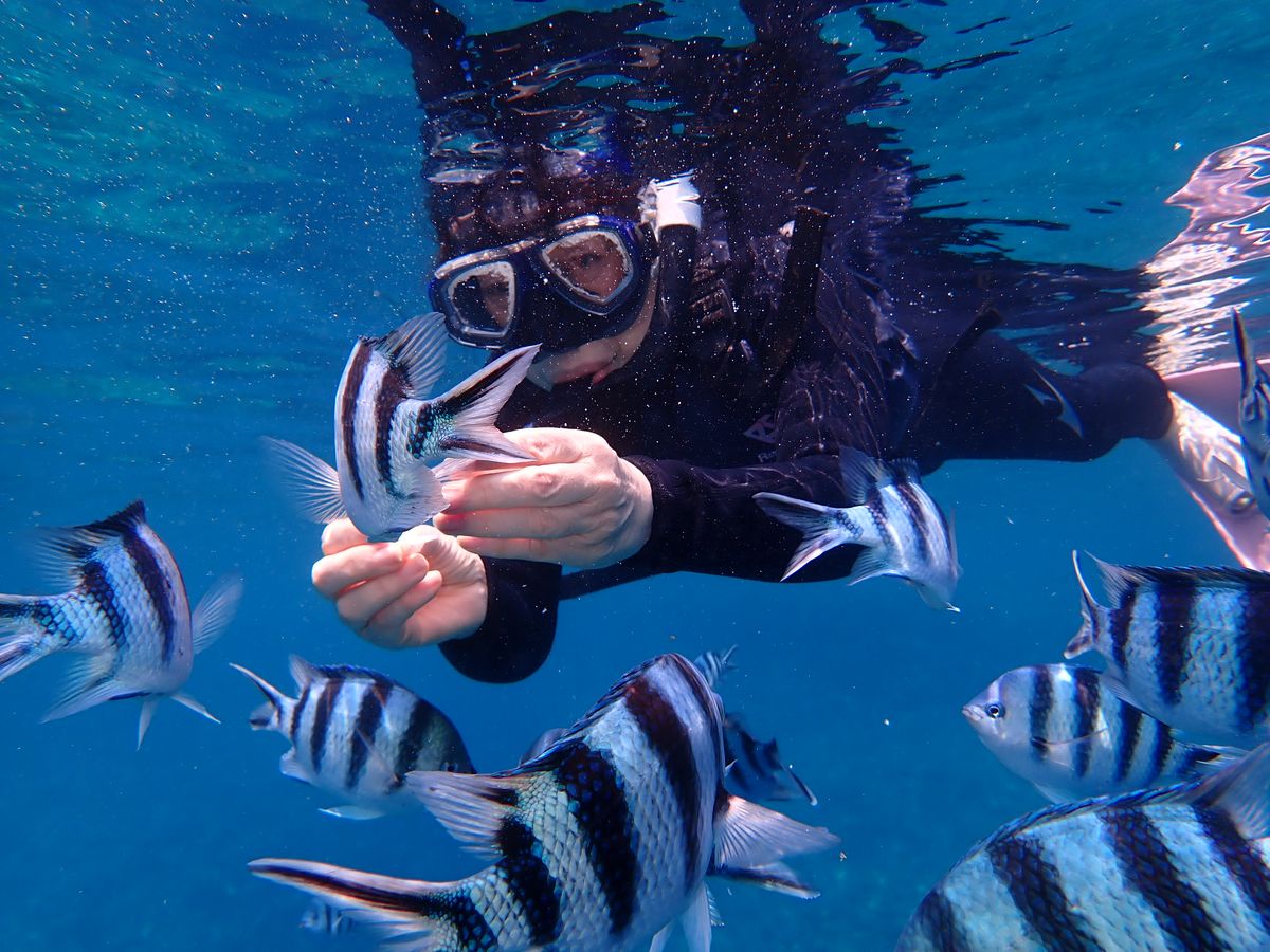 魚の餌付けは、魚を呼ぶだけでなく、魚が私の手元の餌を食べにきてくれて感激でした。