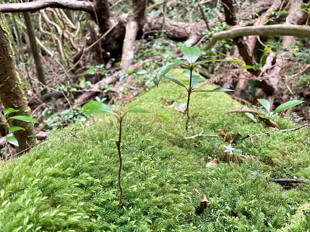 ・16:45頃:苔むす森に到着。日が落ちる前に絶対に見ないといけないスポットに間に合うことができてホッとしますが、ここからペースが下がると暗い山道を下る必要が出てくるということで急いで下り再開です。