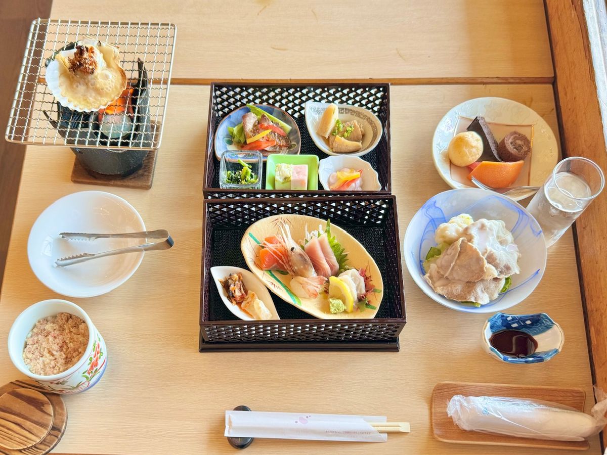 The lunch featuring local vegetables and scallops was delicious, and the round pudding from Bokka was also tasty.
