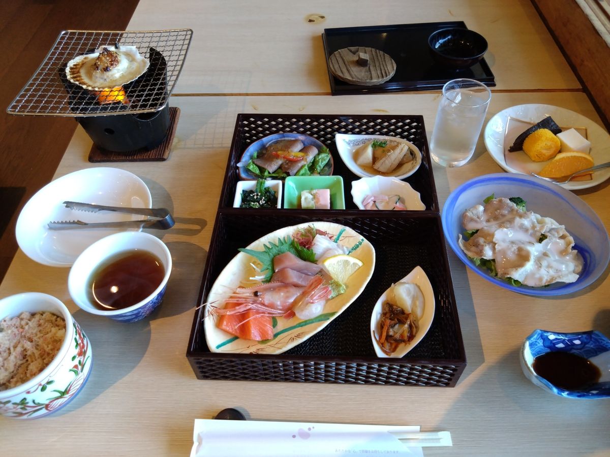 The lunch featuring local vegetables and scallops was delicious, and the round pudding from Bokka was also tasty.