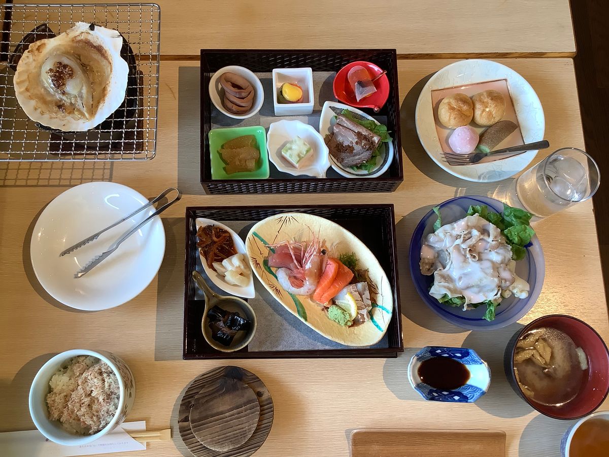 For lunch, we enjoyed Ishizaka beef hamburgers and Miminga at a restaurant with a nice view, and everything was very delicious.