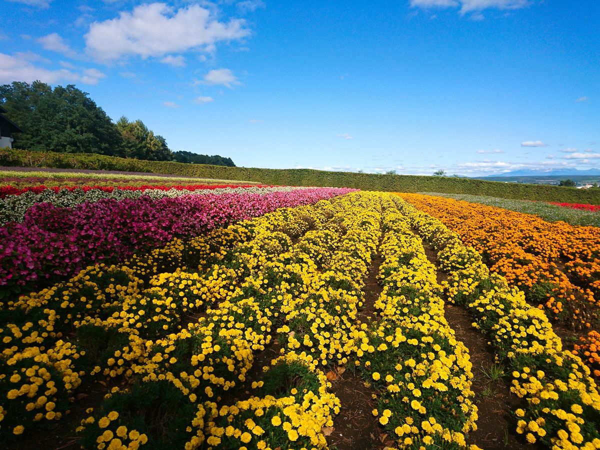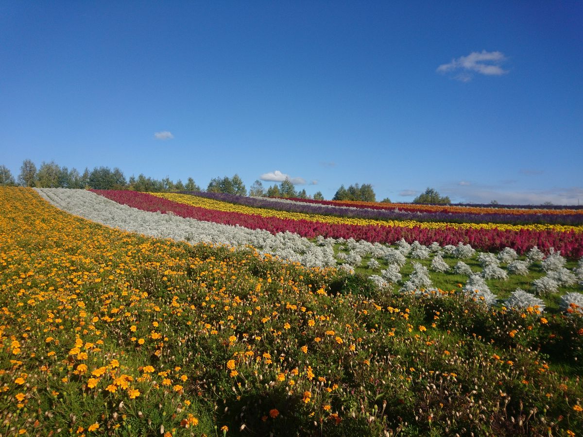 We visited the Rokkatei souvenir shop, had cheese fondue and hamburgers for lunch, went to Farm Tomita, saw the roller coaster from the bus window, visited Shikisai no Oka, the Blue Pond, saw the patchwork hills from the bus window, and then returned to the city.