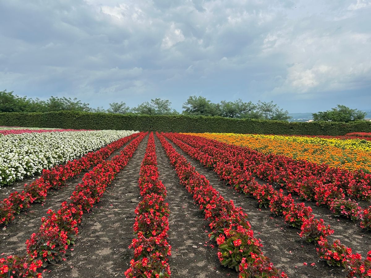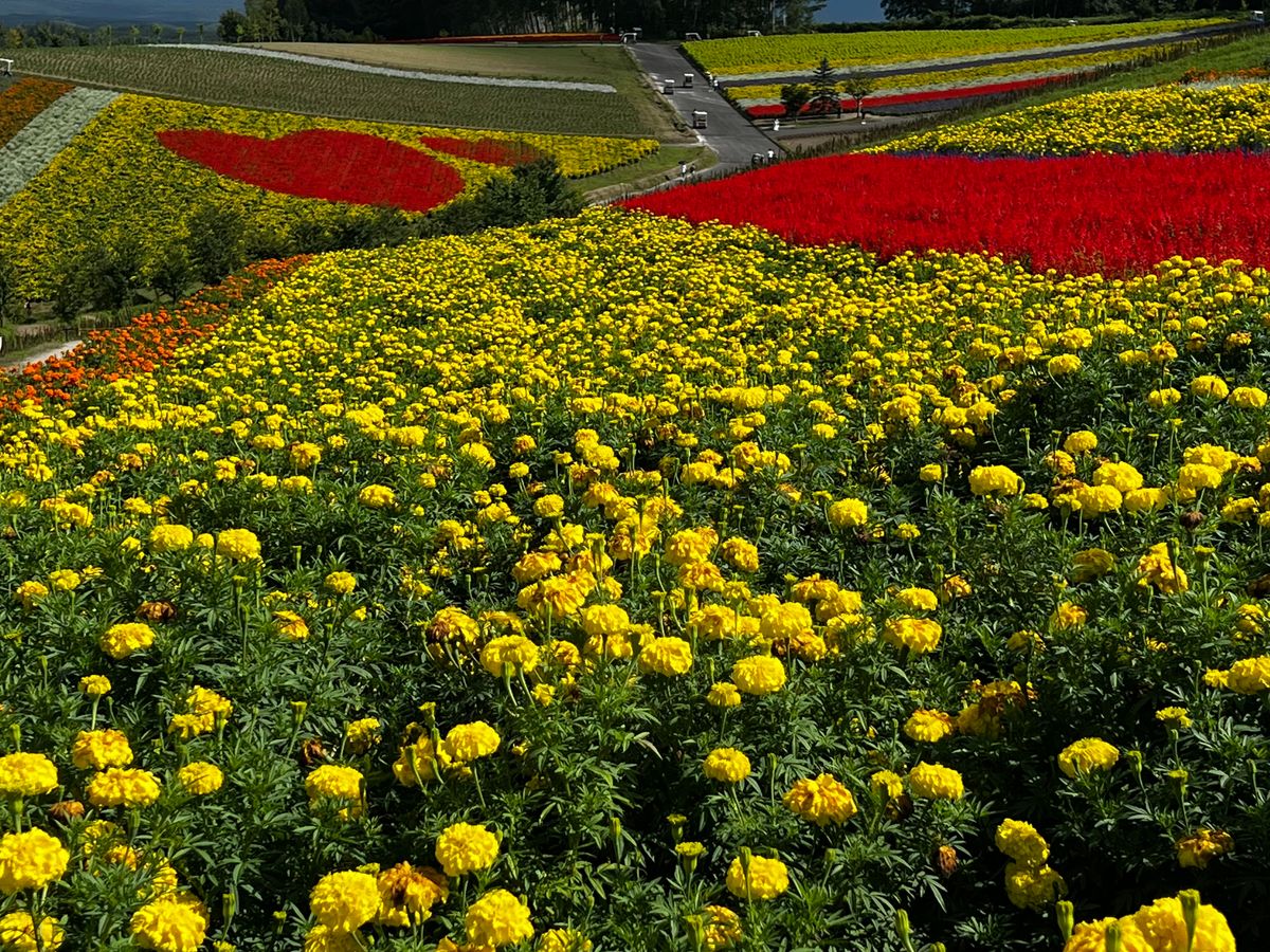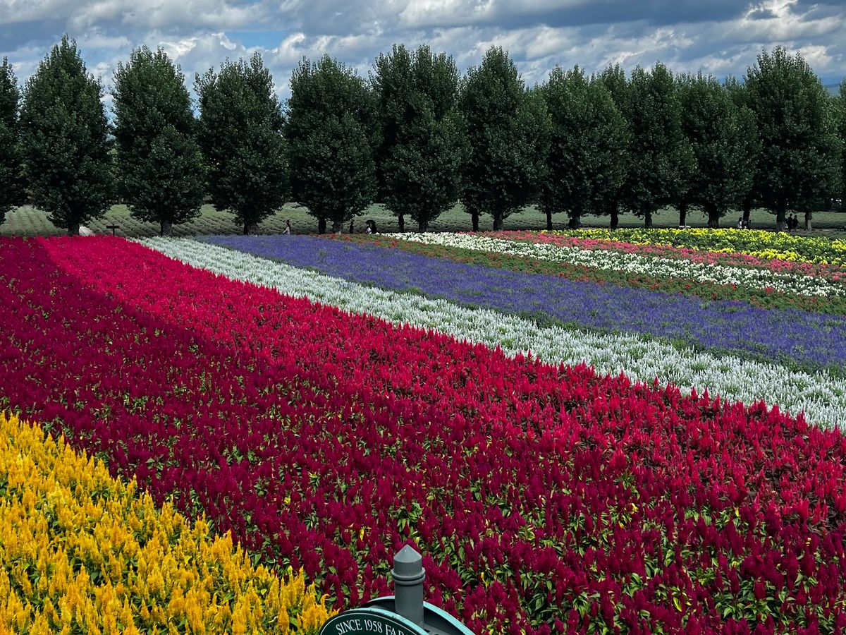 そして、このツアーで最も感動したのが四季彩の丘です。なだらかな丘の上に、色とりどりの花畑がまるでパッチワークのように広がっており、そのスケールの大きさに圧倒されました。天気が回復して青空が広がったこともあり、花々の鮮やかさが一層際立って見えました。カートに乗って丘を巡るのも楽しく、どこを切り取っても絵になる絶景でした。