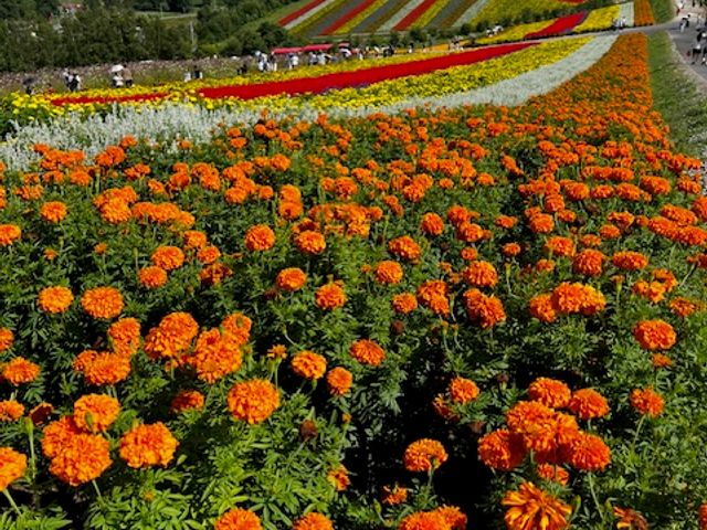 The most impressive part of the tour was Shikisai no Oka. On the gentle hills, colorful flower fields spread out like a patchwork quilt, and I was overwhelmed by the sheer scale of it. With the weather improving and the blue sky appearing, the vibrancy of the flowers stood out even more. Riding a cart around the hills was enjoyable, and every view was picture-perfect.