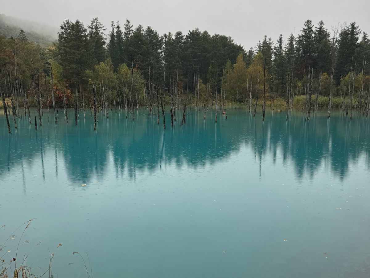 肝心な天気は曇っていたのですが、後半は雨が降ってきました。青い池は綺麗な青い色をしていましたが晴れた姿も見てみたかったです。