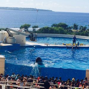 At the Okichan Theater in the Churaumi Aquarium in Motobu Town, I was healed by the adorable dolphin show, laughing many times and returning to my childhood. Being here, both young and old felt like there wasn't enough time, and before I knew it, it was time to gather, leaving me with a sense of regret as I boarded the bus. The purple sweet potato tart at the snack shop was the best, and the fresh tart that can only be eaten here left a lasting memory of its delicious taste.