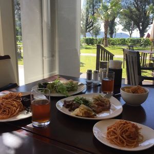 ハイキングを終えた後は、しばし南下をしてJALプライベートリゾートオクマへ向かいます。このリゾートホテルの敷地内にある天井の高い、実に広々としたレストランでブッフェスタイルの昼食を食べます。沖縄そばからミミガーまで様々な料理があり、こちらも楽しい充実した食事となりました。