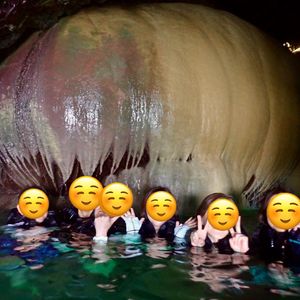We moved a little further in and were shown the deeper parts. We received an explanation about a shrine that only the islanders known as Yuta can enter, took a group photo, and finally jumped into the sea from above the pumpkin-shaped cave. I later learned that there are currently five Yuta, all women in their 90s. I wonder what will happen in the future. Everything feels so mysterious!