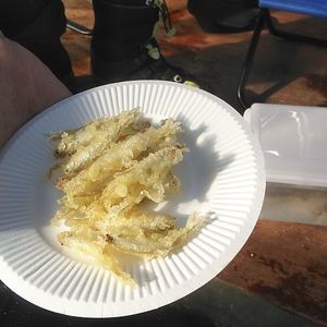 釣りの施設は4~6人ほど入れる小さなビニールハウス。小さな簡易ストーブが1つありますがじっと釣りをするのでなかなか寒いです。冷える方は靴用のカイロをおすすめします。道具は手作り感満載の竿に餌に虫をつけたサビキです。釣果は約2時間釣りをして4人で9匹。ワカサギって6センチ位でメダカを大きくしたやつって感じでかわいい。ガイドさんが今日は食いつきが悪いとおっしゃってましたが釣れなさすぎてがっかりしました。でもガイドさんは何匹も釣っていたのでコツがあるんでしょうね。釣れたワカサギは天ぷらにしてくれてとてもおいしかったです。当たり前かもしれませんが釣った分しか食べられないので釣れなかったら何も面白くないです。私がガイドなら前もって釣って生かしておいて釣れない人にも5匹位は食べられるようにしてあげたいなと思いました。