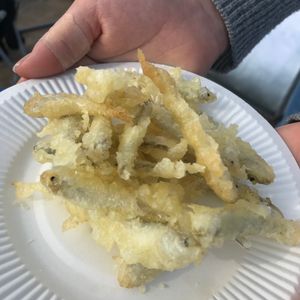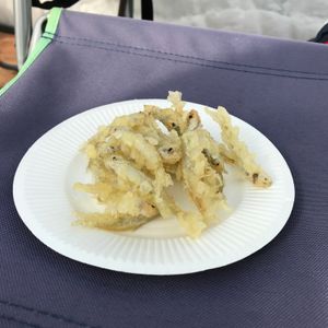 The fishing facility is a small vinyl house that can accommodate about 4 to 6 people. There is a small portable stove, but since you sit still while fishing, it can get quite cold. I recommend using foot warmers if you feel chilly. The fishing gear consists of a handmade rod and sabiki baited with worms. After about two hours of fishing, we caught 9 fish among four people. The wakasagi are about 6 centimeters long and look like larger medaka, which is quite cute. The guide mentioned that the fish weren't biting well today, and I was disappointed because we didn't catch many. However, the guide caught several, so there must be some tricks to it. The wakasagi we caught were made into tempura, and it was very delicious. It may be obvious, but you can only eat what you catch, so if you don't catch anything, it won't be fun at all. If I were the guide, I would want to catch some in advance and keep them alive so that those who don't catch any could still enjoy about five fish.