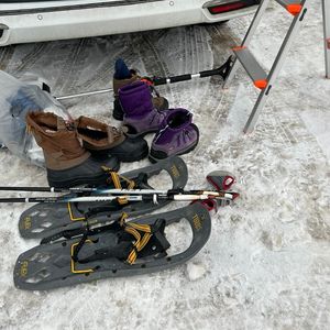 In the parking lot, we changed into the rented winter clothing, shoes, gloves, and hats, and put on our snowshoes.