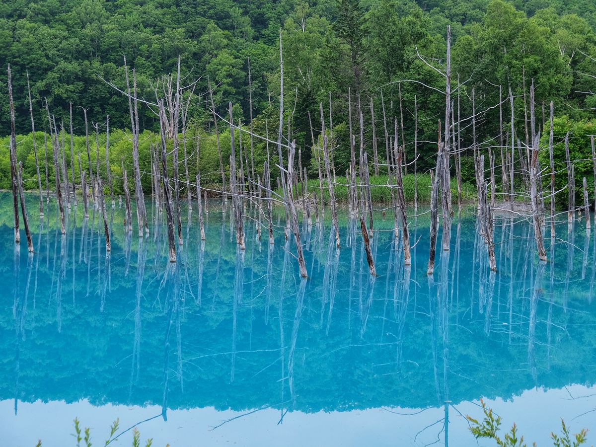 青い池に着いた頃には雨が降って来てしまいましたが、水が濁る事も無く神秘的な景観を楽しむ事が出来ました。
